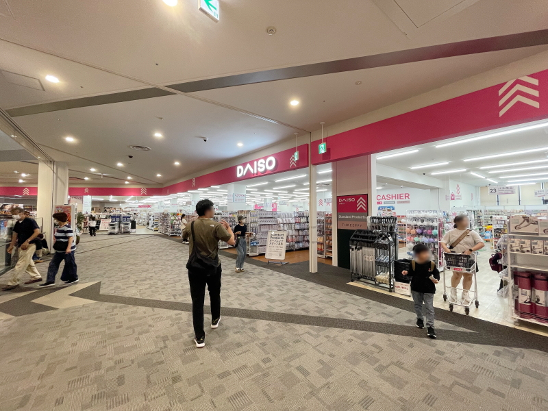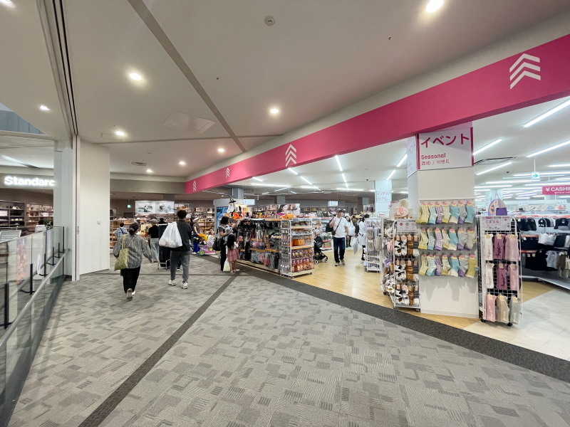 2階南側の複数の退店済テナント区画と喜久屋書店の区画を集約し、ダイソーの複合店がオープンしました。ダイソーの一部は9月に先行開業していましたが、全面オープンによってそのスケールは3階にあった頃よりも大きく拡大。