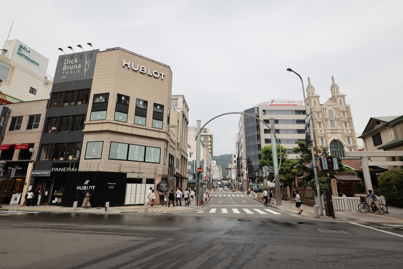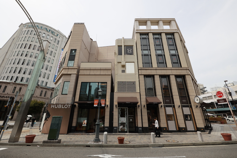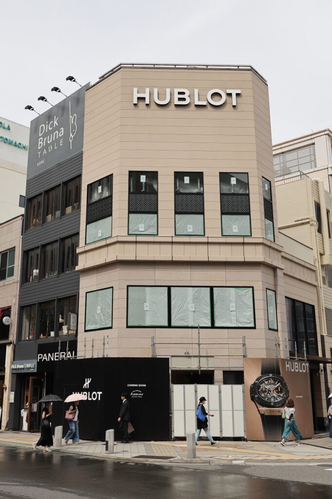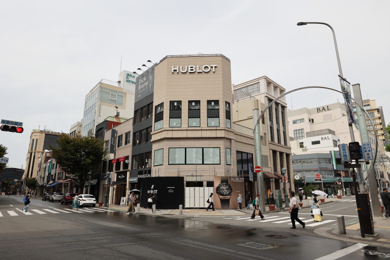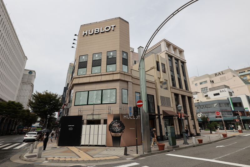 HUBLOTのロゴが頂部に踊るコーナーのビルも本店と同じ外装デザインが採用されています。本店ビルの次に大きな規模の建物です。