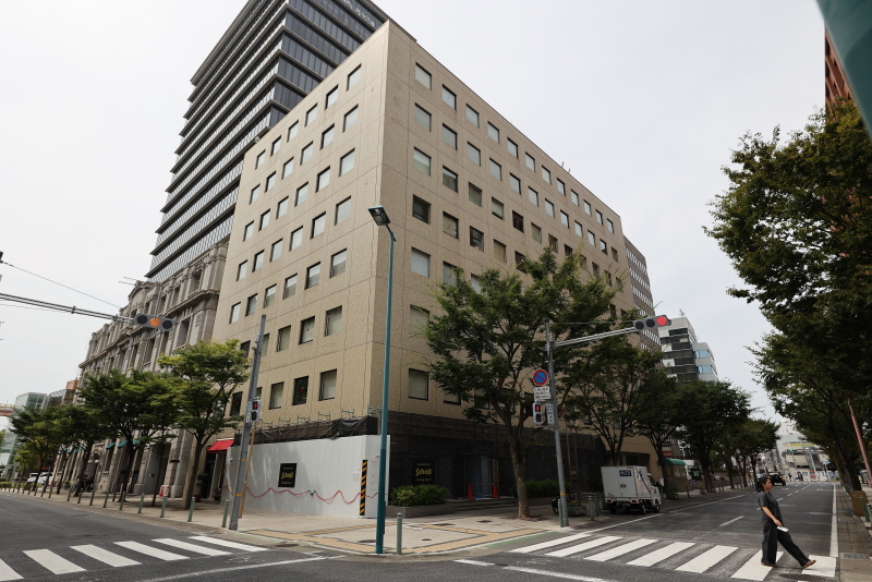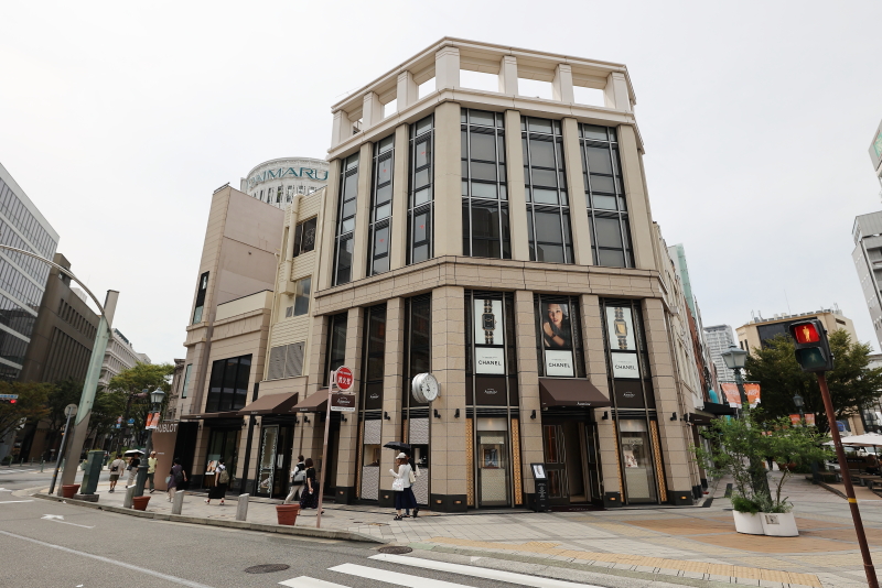 本店ビルの南にある狭小ビルを取得して外装デザインや色調を本店と統一化。更にその隣に新築ビルを建設し、これも外装を本店と合わせました。