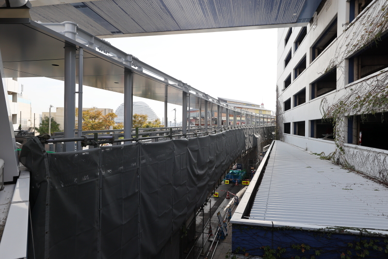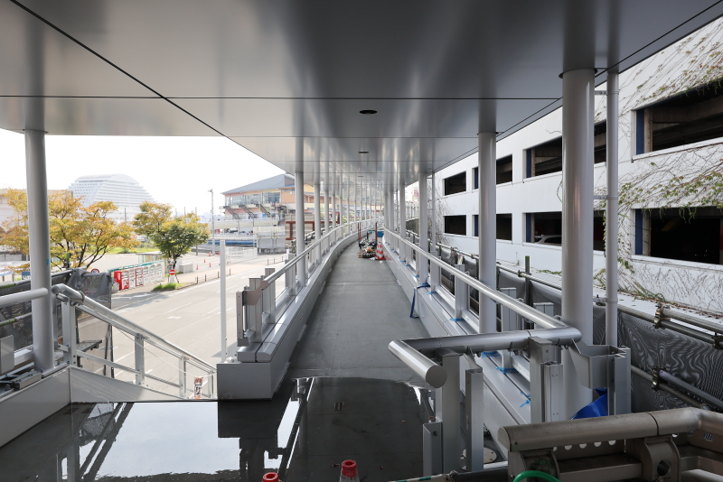 キャノピー(屋根)が付いた状態で上部の養生ネットは取り払われました。umieへのアクセス向上も勿論の事、ウォーターフロントの景色を眺めながらの空中散歩を楽しめるデッキとしても重宝される存在になります。