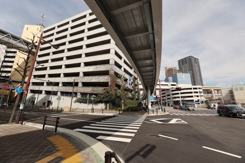デッキ上から眺めたumieと立体駐車場・プロメナ神戸間の道路です。この道路を跨ぐデッキはこれで4本になりました。