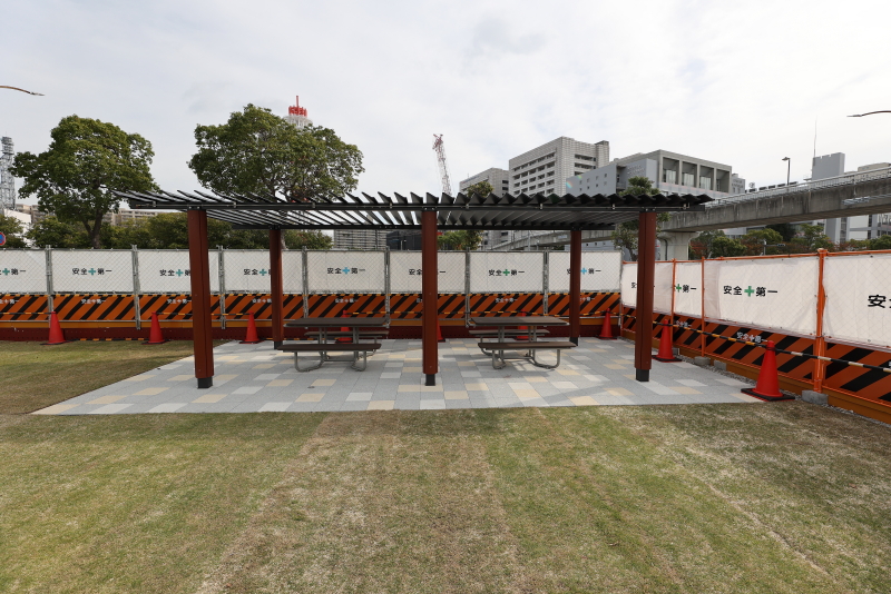 再開発予定エリアの開発用地を暫定的に広場にしている例はこれまでも都心再整備やウォーターフロントエリアで散見されています。しかしこの公園はそれらよりも本格的な整備内容が施されているように見受けられます。