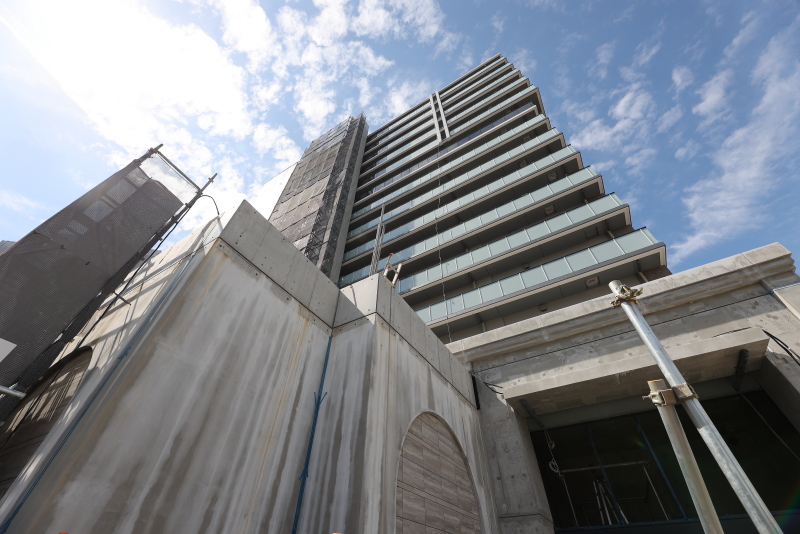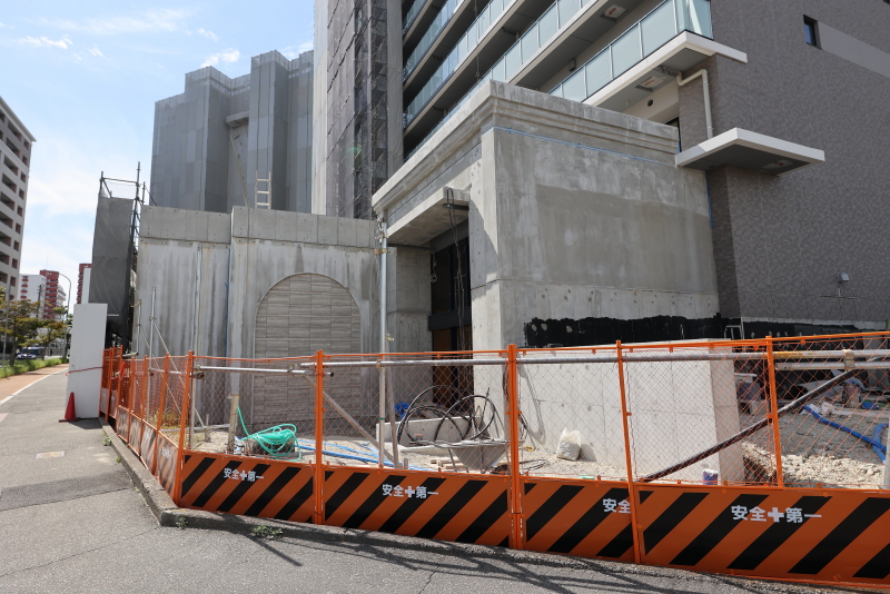 まだ内装工事はこれから本格化していく模様ですが、外観はバルコニーのガラス手摺も取り付けが完了しました。ガラスには不透明のタイプを採用しています。