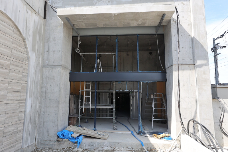 吹き抜けのエントランスホール。サッシの枠は取り付けが完了。ガラスはこれから入るようです。シンボリックなエントランスアプローチに仕立て上げられる予定です。
