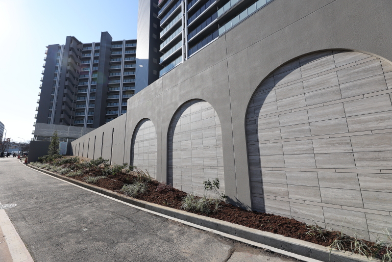 高低差のある土地に建設された為、通常の擁壁の代わりに、アーチ型が特徴的な壁が構築されました。