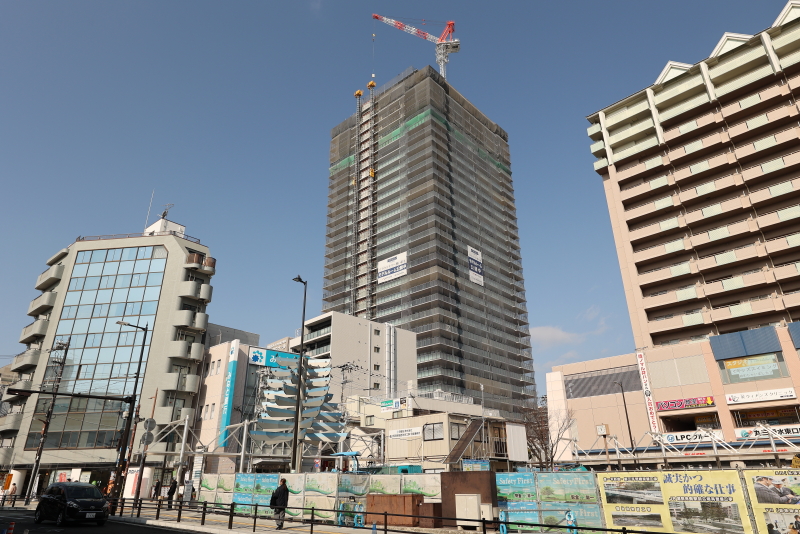 垂水駅前のランドマークとなる地上32階建のプラウドタワー神戸垂水。既に上棟し、スカイラウンジとなる最上階の32階と塔屋の構築が進められています。