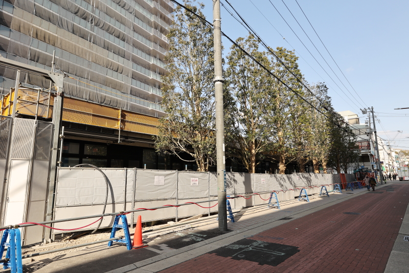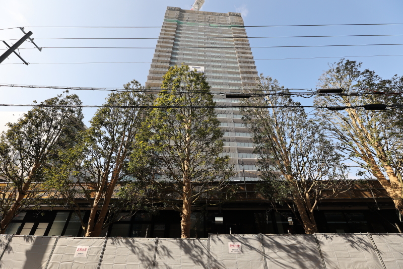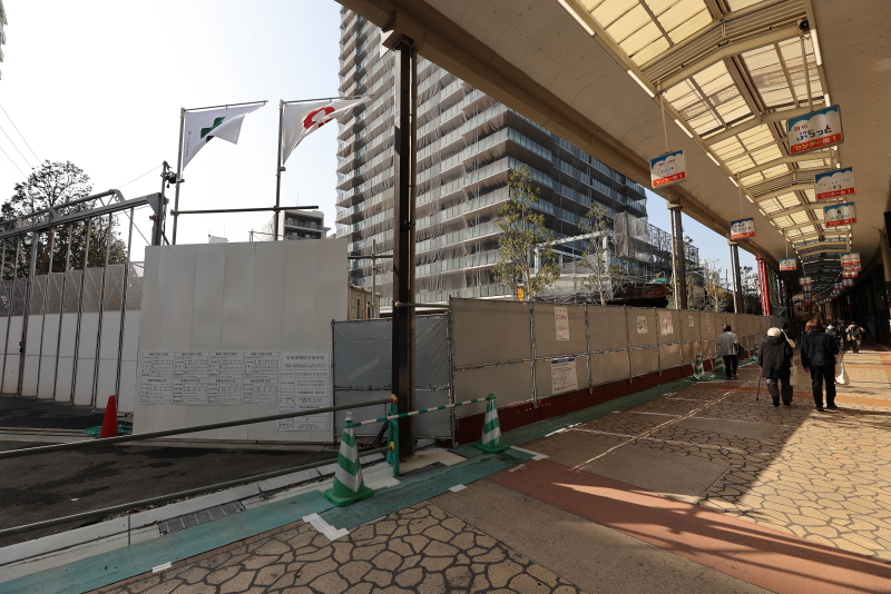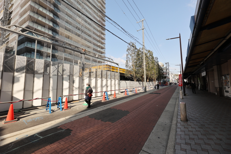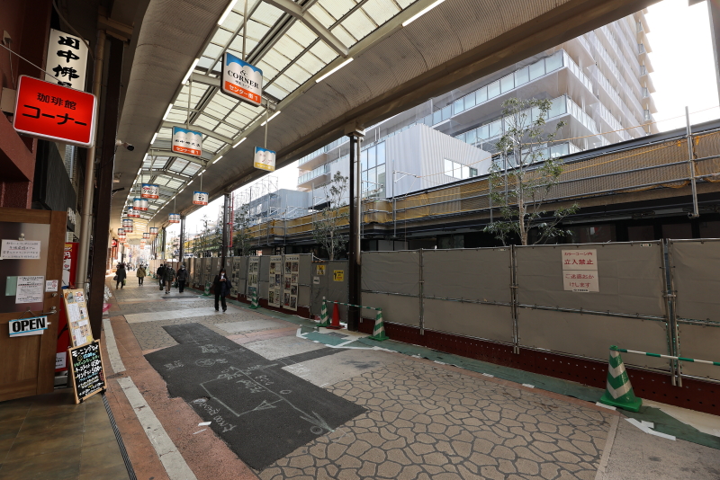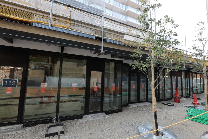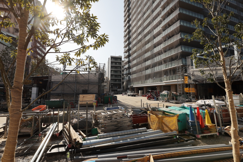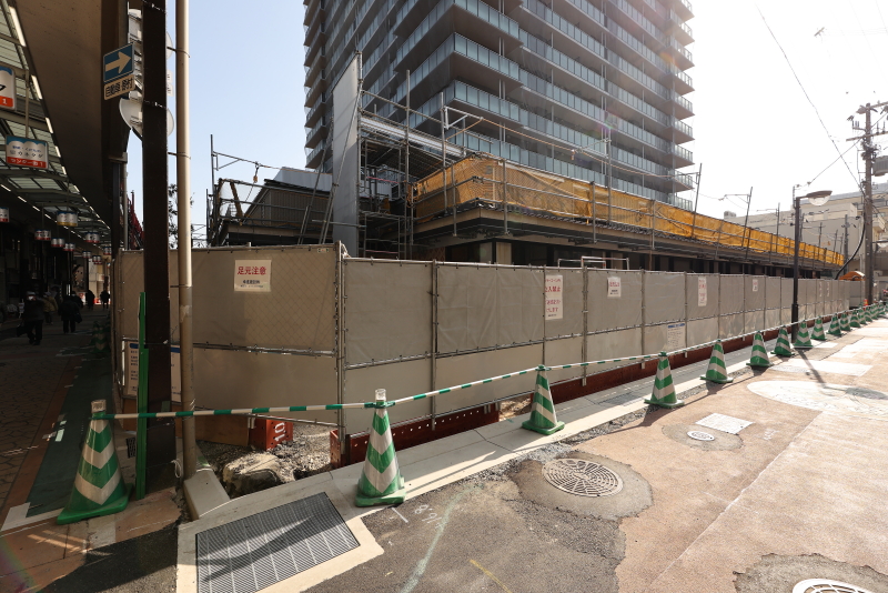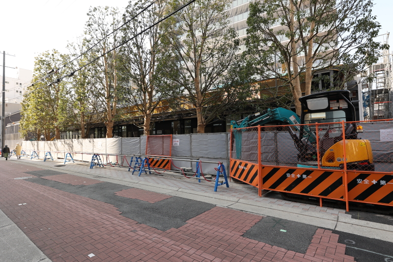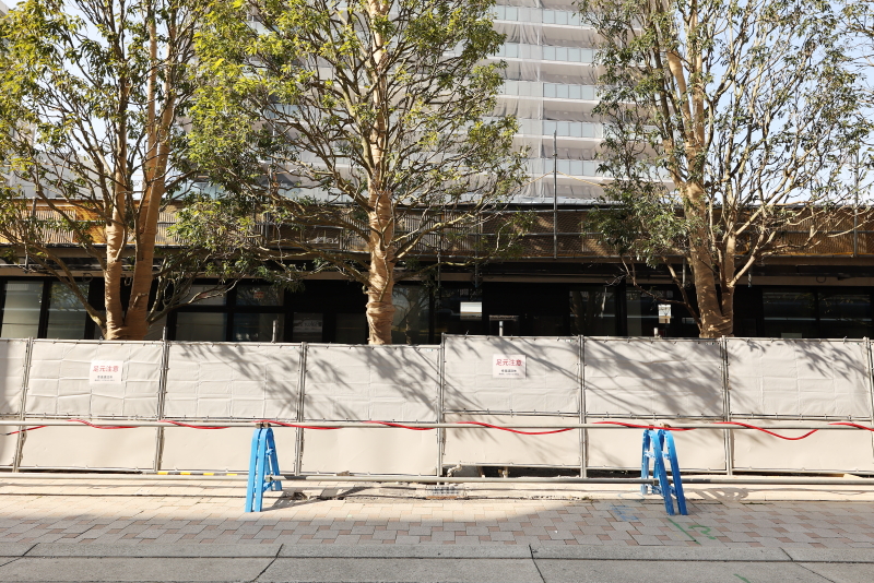 既に敷地の外周にあった鉄板の仮囲いは撤去が進み、コの字型に配置された低層店舗棟が見えるようになってきました。