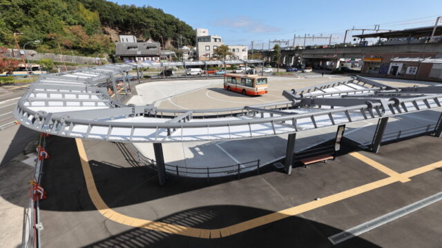 仮囲いに描かれたこれまで公開されていたものよりも高精細なパース。階段状の特徴的なデザインが特徴的な鈴蘭台の新ランドマークとなる予定です。地域の交流拠点としても活躍しそうです。