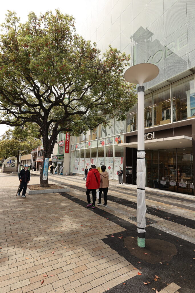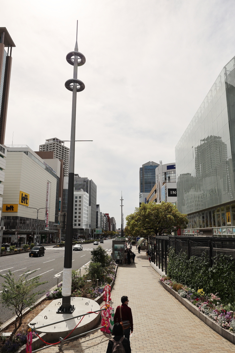 またこれも三宮北交差点周りに既に設置されているものと同じ背の低い朝顔の花のような形状のデザイン照明も歩道中央に設置が始まりました。
