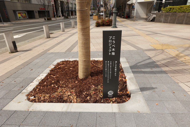 これも「こうべ木陰プロジェクト」の一環のようです。既に交差点の北角・国際会館前にも六甲山から運び込まれた木が植えられています。