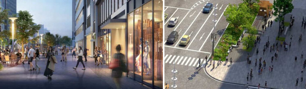 歩道の美装化によって、中央幹線前から三宮本通までの区間がリニューアルされる計画です。舗装ブロックの刷新、ベンチやウッドデッキの設置、デザイン照明の設置によって、駅前周辺の雰囲気が統一され、玄関口の一体感が強調されます。