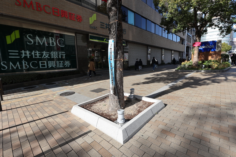 既存街路樹のシマトネリコはライトアップとイルミネーションによる夜間照明演出が図られています。