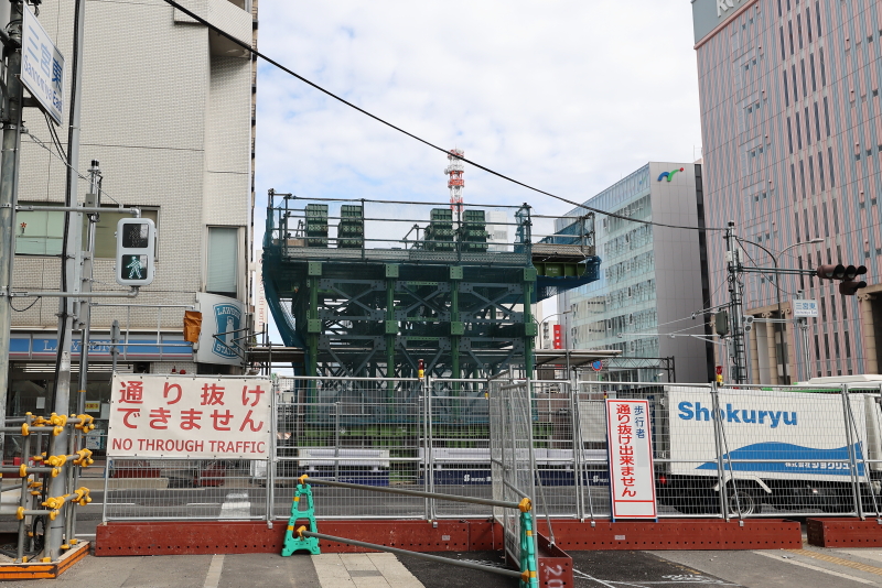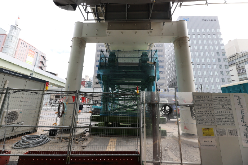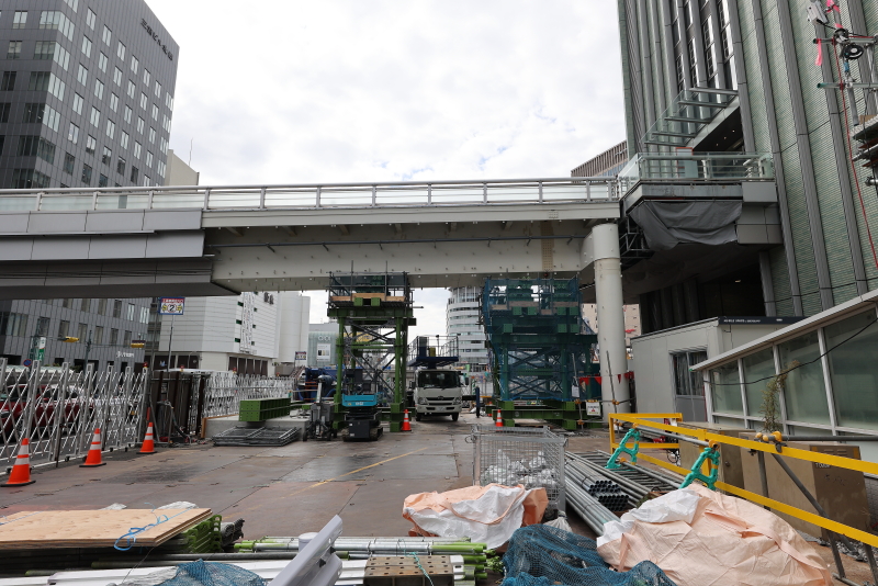 歩道橋と新デッキが交差する北側部分の鉄骨の橋桁が剥き出しになっています。