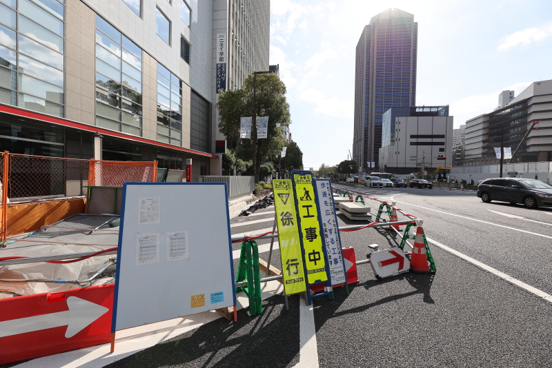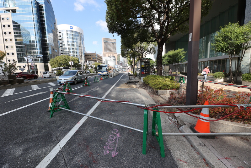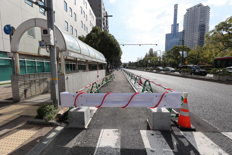 市バス停留所も歩道拡幅によって場所を移設する必要があり、既設施設は閉鎖され、仮設のバス停が設置されました。