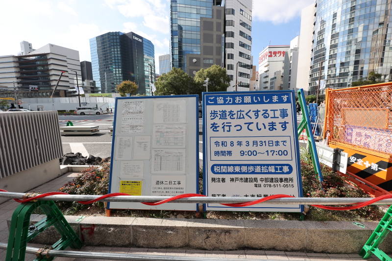 フラワーロードの東側歩道を拡大する税関線歩道東側拡幅工事が進行しています。工事対象区間は、神戸国際会館前交差点から葺合南号線まで。