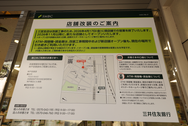 その中核テナントである三井住友銀行三宮支店が4月17日をもって改装の為、閉店します。11月以降に新店舗としてオープンするとの事。但しATMは継続して利用が可能のようです。