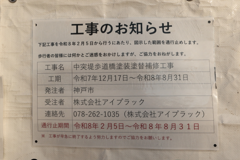 工事の内容は「中突堤歩道橋塗装塗替補修工事」。北館の解体が進められる際には南館と同様に既存歩道橋も撤去されるものと思っていましたが、補修を行うのであれば今後も利用を継続するという事でしょうか。
