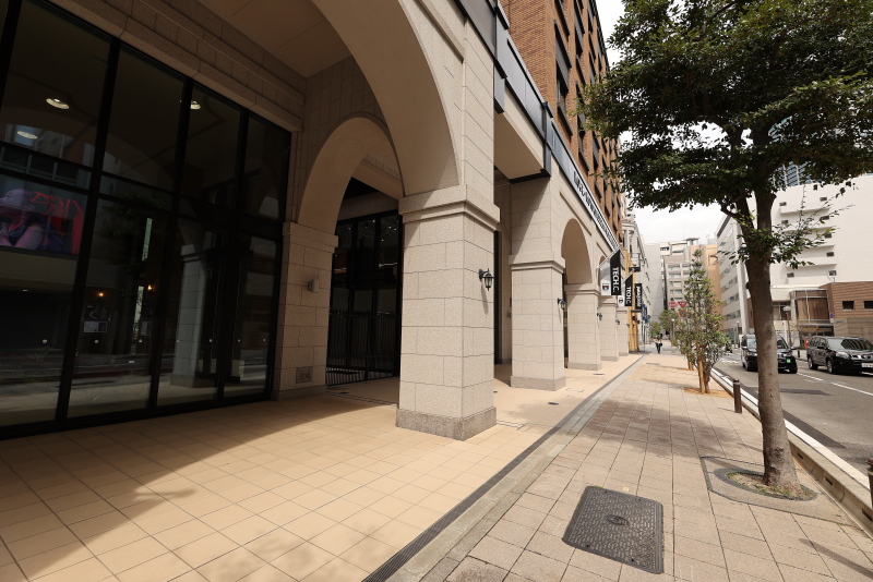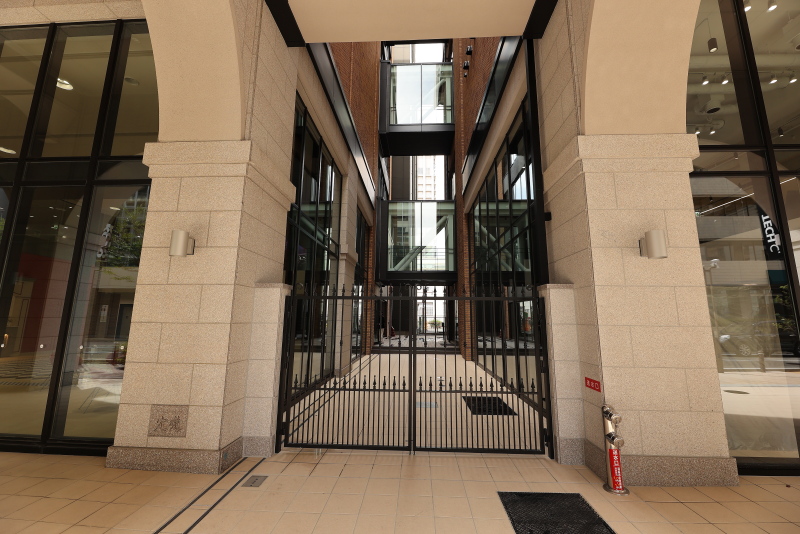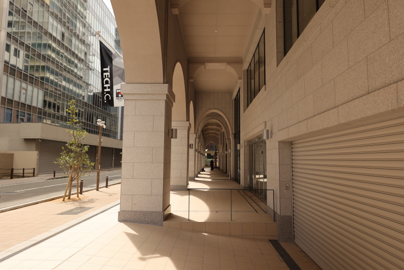大丸神戸店の低層部のようなアーチのピロティ内。2棟の建物を貫き、長さが特徴的です。
