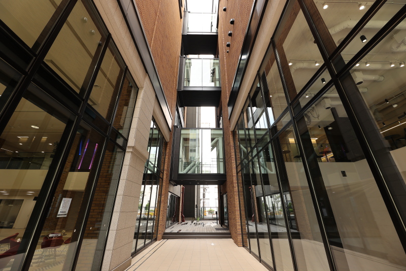 しかし2棟の間を自由に行き来できるようにする渡り廊下が2、3、4階に3本が整備されました。完全にガラス張りのモダンな渡り廊下がクラシックな全体デザインに対してコントラストを生み出しています。