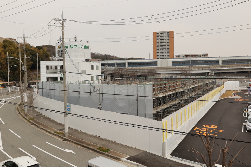 西側の街区にはあなぶき興産が分譲マンション「アルファステイツ伊川谷駅前」を建設中です。既に地上階の躯体構築工事が進んでいます。