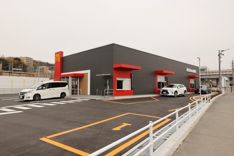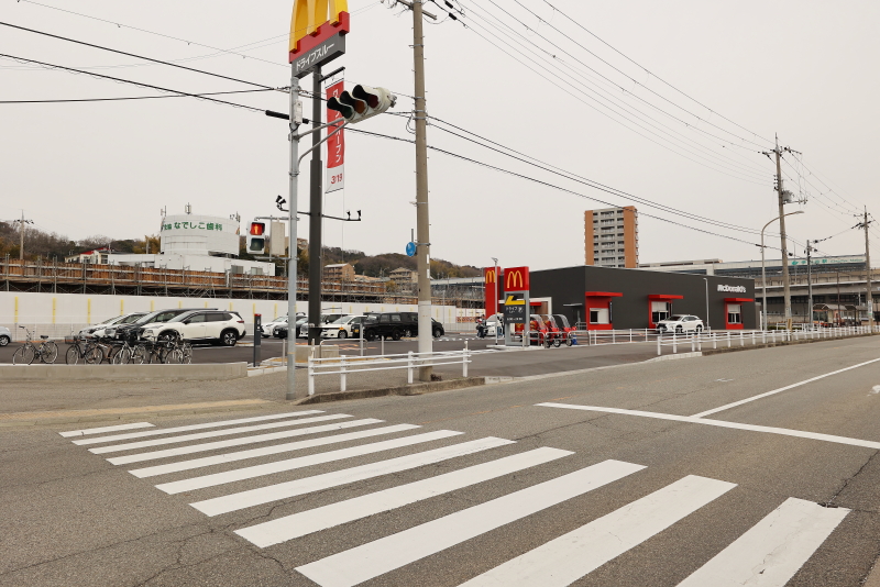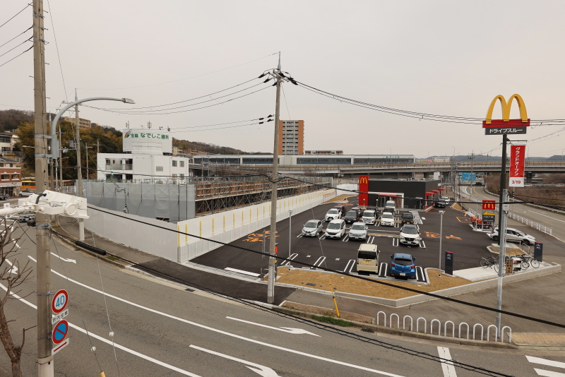 駅前広場に面した東側街区にオープンしたマクドナルド伊川谷駅前店。広い敷地を活用して駅前立地でありながら、ドライブスルーを併設しています。