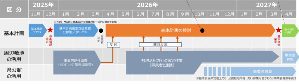 次の工程としては基本計画を策定していく事になりますが、これを支援する民間事業者を公募で選定し、来春より計画を検討します。この計画の過程で、ようやく新庁舎のフロア構成やデザイン等、我々が最も気に掛けている内容が固まっていく事になります。従って県公館や周辺敷地の活用に関する事業者募集が先行していく模様です。