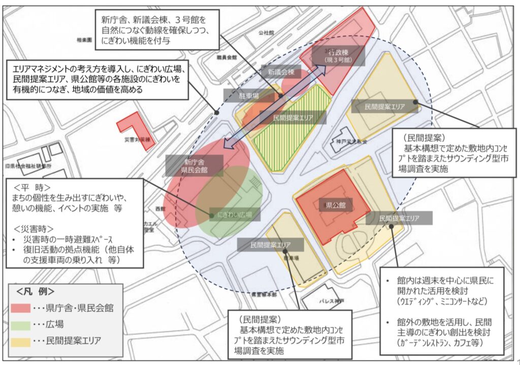 県庁舎の建て替え方針が固まれば、次に2号館や県民会館跡地、兵庫県警本部の東隣の県有地、そして県公館の民間活用の検討にシフト化する事が可能となります。各街区について、神戸市同様にサウンディング型市場調査を実施し、それぞれの活用策検討案を民間に委ねるのが得策でしょう。