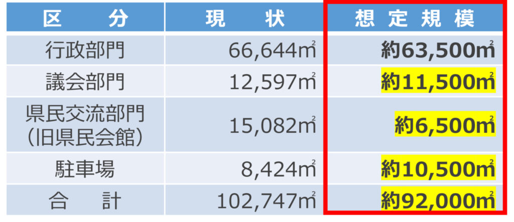 今回の基本構想案では、示された新庁舎単独の床面積については、具体的には示されていません。行政部門は63,500平方メートル。県民交流部門は6,500平方メートル。これらを足すと70,000平方メートルですが、行政部門には既存の3号館が含まれているので、ここから28,000平方メートルを引くと、42,000平方メートルが新庁舎の床面積と予想されます。