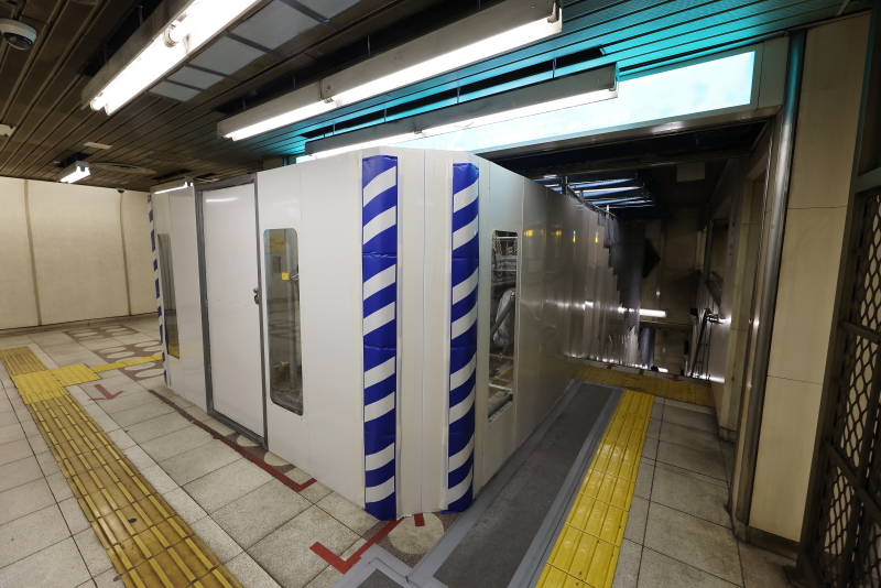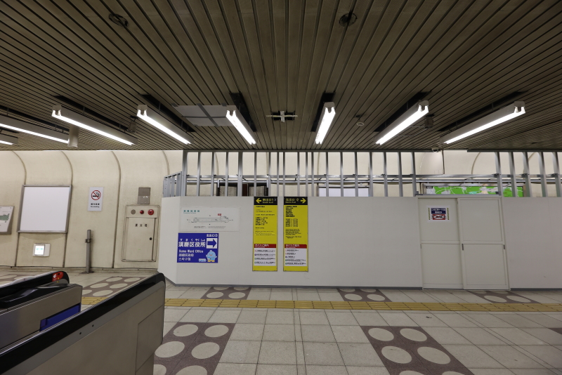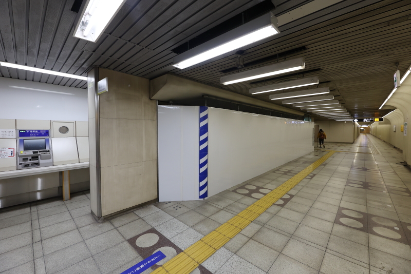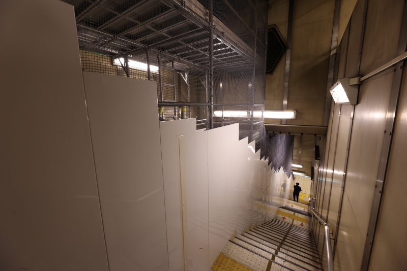 エスカレーター以外の改修工事は改札外コンコースにて進められています。壁や天井パネルの一部が既に撤去されており、仮囲いも設置されました。