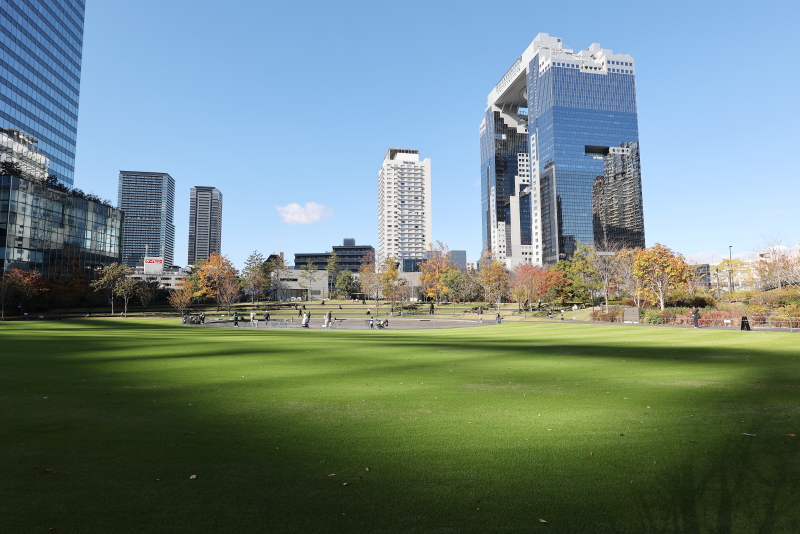 グランフロント大阪やうめきた地区のノースパークの建物も一体的に美しく全景を拝む事が可能です。