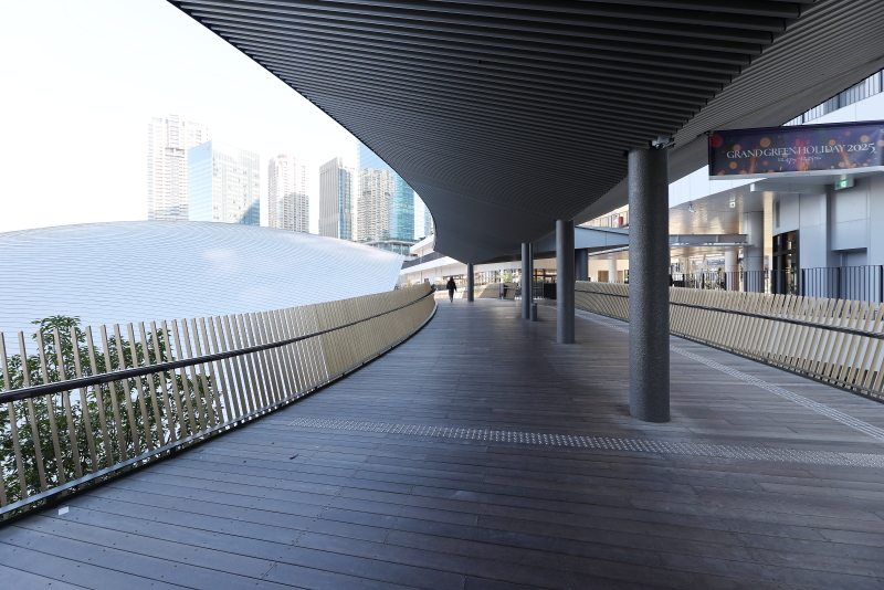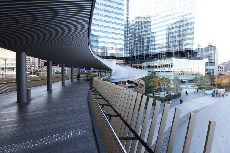 緩やかな曲線を描くデザインが特徴で、地上よりも高い視点から、公園の緑や周辺の超高層ビル群を眺めることができ、まるで空中を散歩しているような感覚を味わえます。