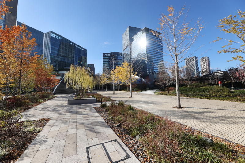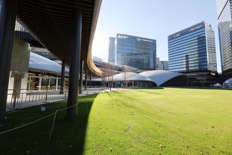 現在、完成しているのは、南側のサウスパーク。「MIDORI LIFE(みどりライフ)」をコンセプトにしており、単なる緑地ではなく、人々の活動や体験が生まれる場所を目指しており、直線がメインの周囲のビルに対し、園内は曲線を多用して柔かな印象を与えています。