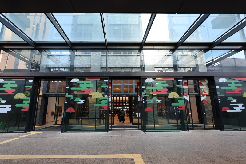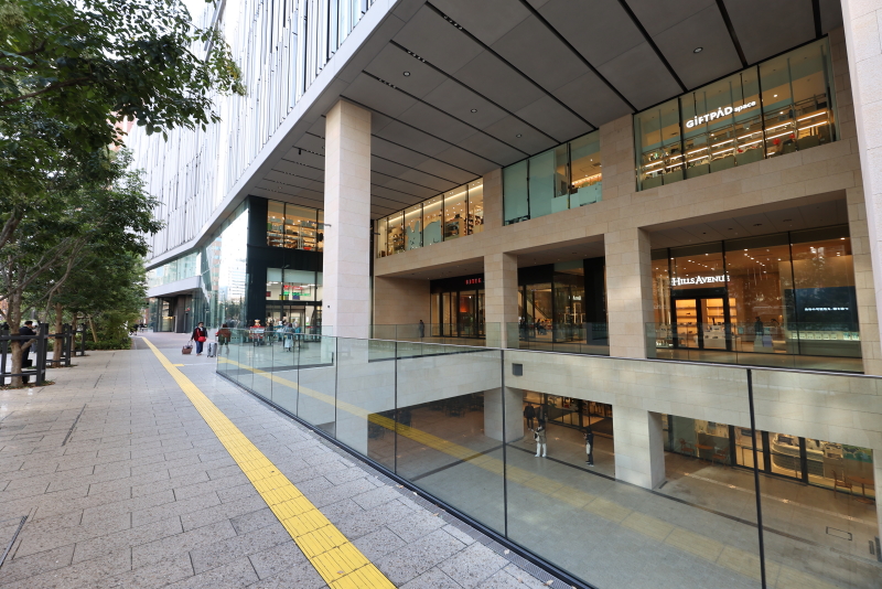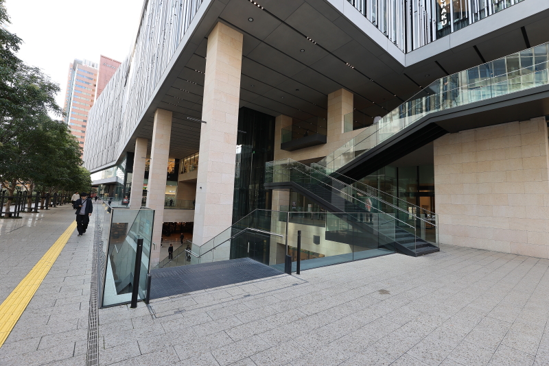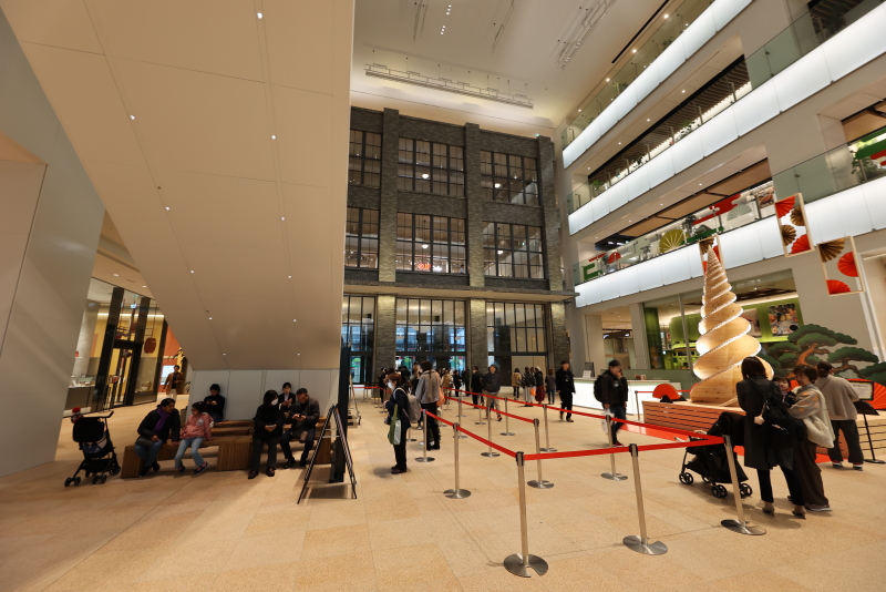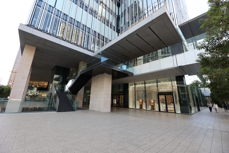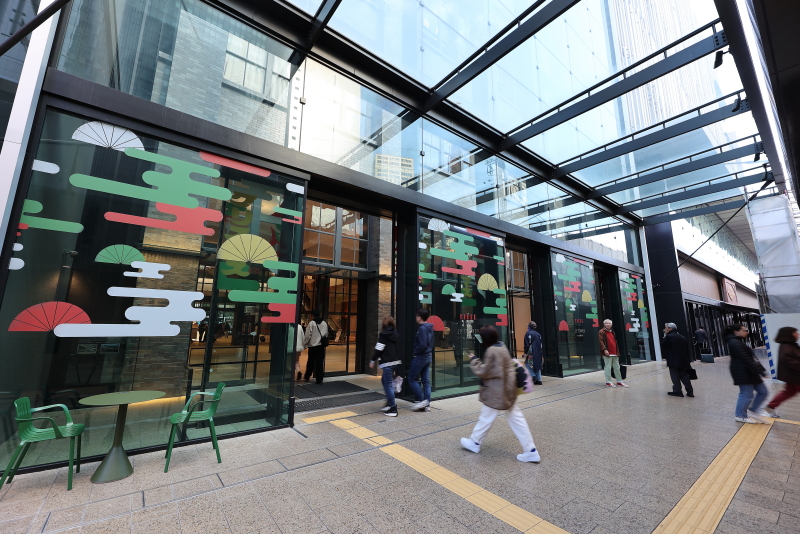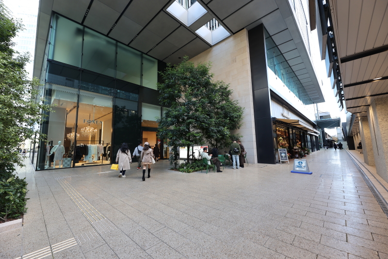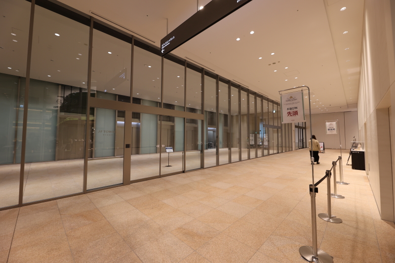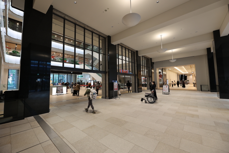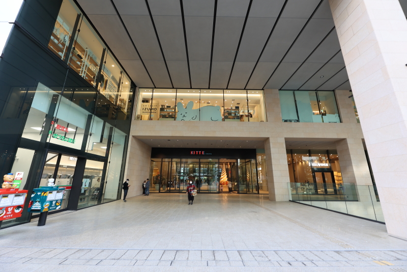 KITTE大阪の南側エントランス。余裕のある床面積を活用して非常に贅沢な空間となっています。