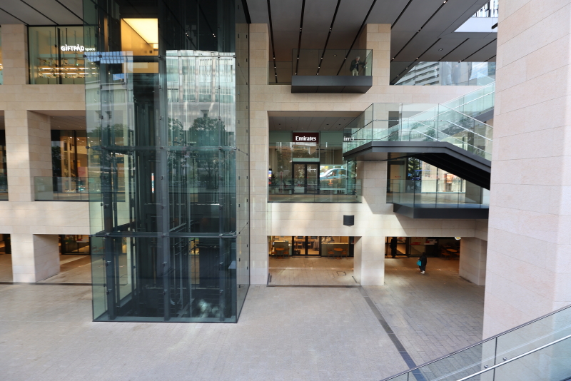 ガラスのエレベータータワーもサンクンガーデンのシンボリックなアクセントになっています。吹き抜けは大きなグリッドによって区切られ、館内から暖かみのある光が溢れます。