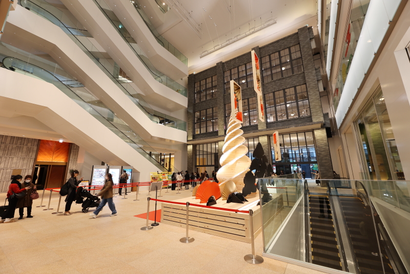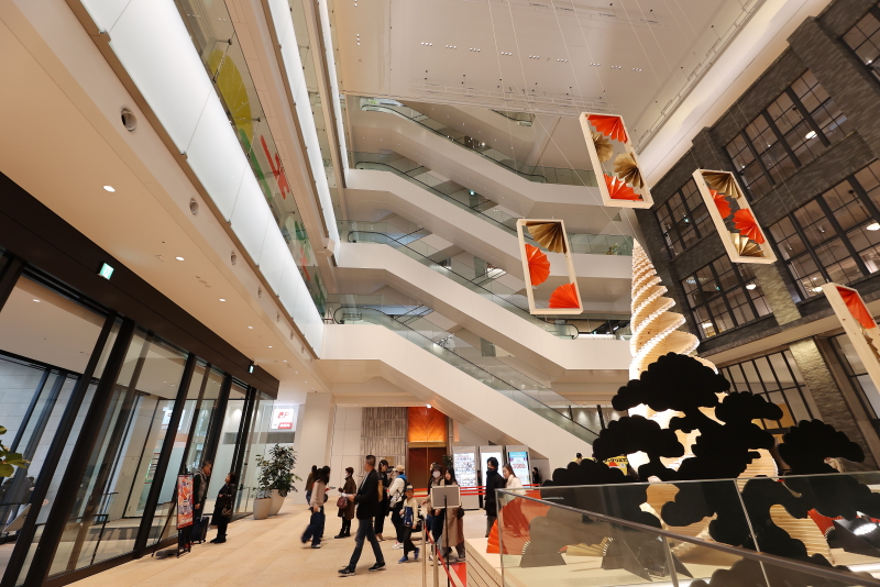 南側には地下階から2階までを吹き抜けにした巨大なアトリウム空間。KITTE大阪の賑わいを通りにも滲み出させる造りとなっています。