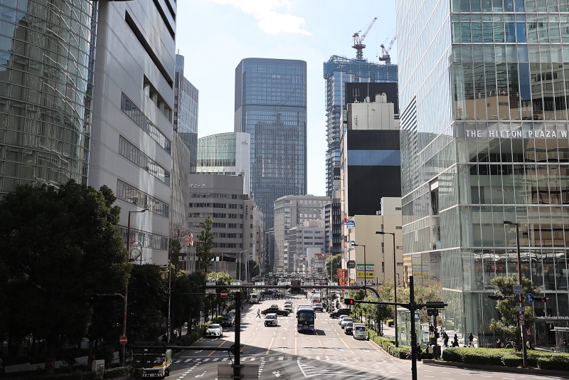 おまけですが、四ツ橋筋を北側から眺めると、フェスティバルタワーの隣に目下、建設中のパークタワー大阪堂島浜が聳えていました。特徴的な塔屋周りのフレーム装飾も構築が進み、梅田から中之島へと拡大する「キタ」の摩天楼が進化を遂げています。