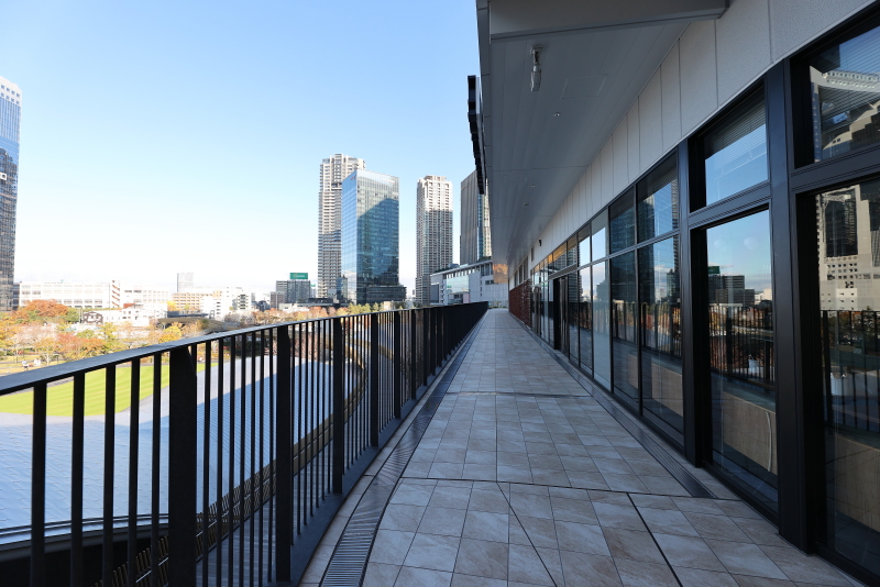 西側の屋外歩廊から芝生広場や周囲の建物を一望し、開放感の高さが際立っています。