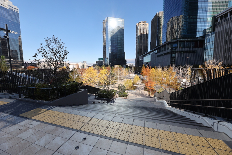 階段の下り方向はうめきた公園へのアプローチにもなっており、まるで都会の中の丘のようです。