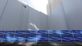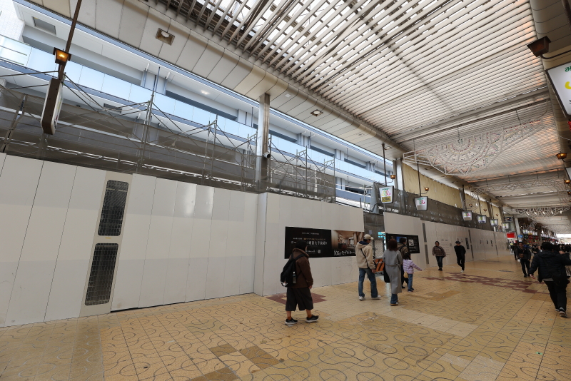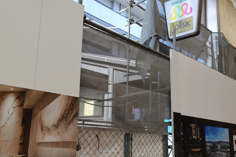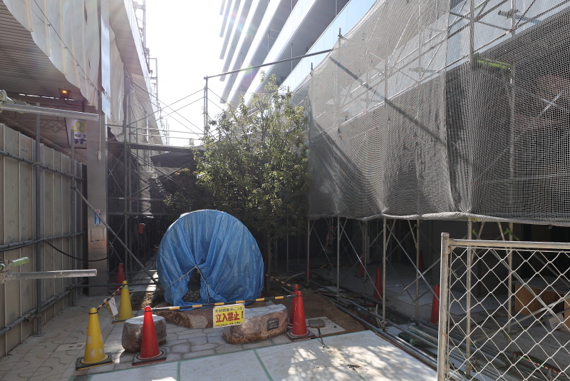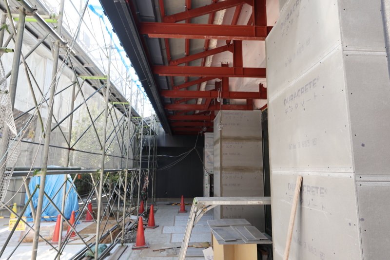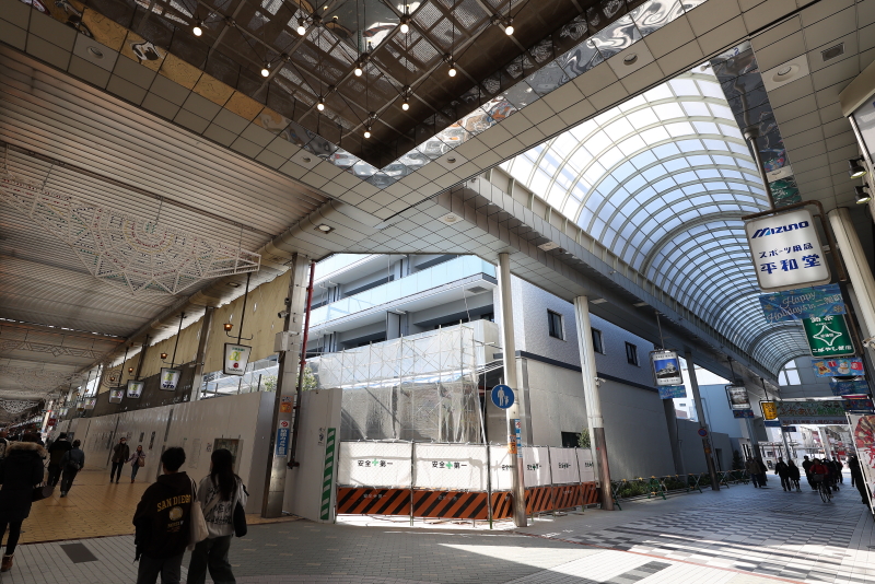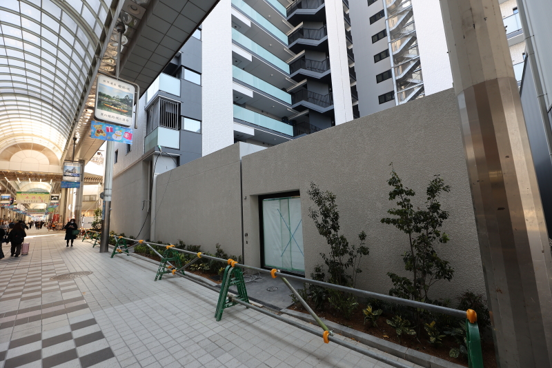 商店街側の低層部はまだ仮囲いが設置されており、6区画入る予定の店舗部分の仕上げ工事が進行しています。