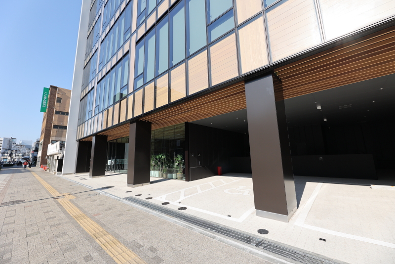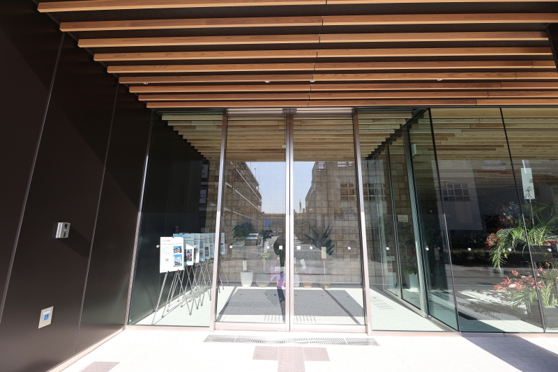 エントランス周りよ様子です。エントランスロビー内には、建設時に出た端材の木材を使って、同社のロゴをモチーフにした巨大な木製ベンチが置かれている他、兵庫県産のアロマエキスを導入し、来館時にはアロマに包まれる体験をする事ができます。