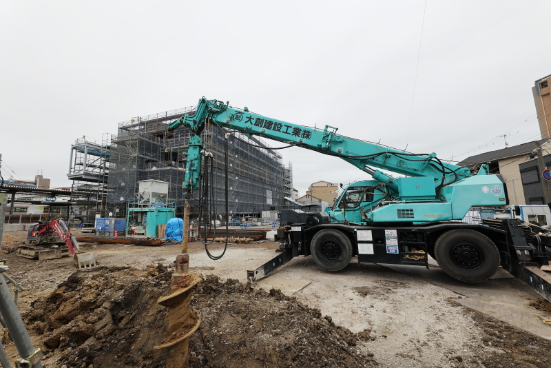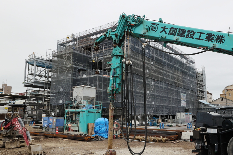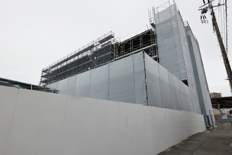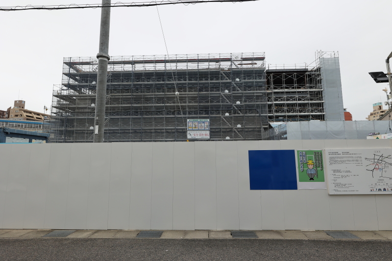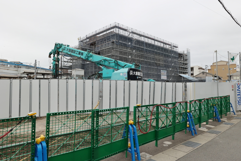 大鉄工業が施工する駅ビル建設は、既に鉄骨建方が完了しており、躯体は足場に覆われていました。