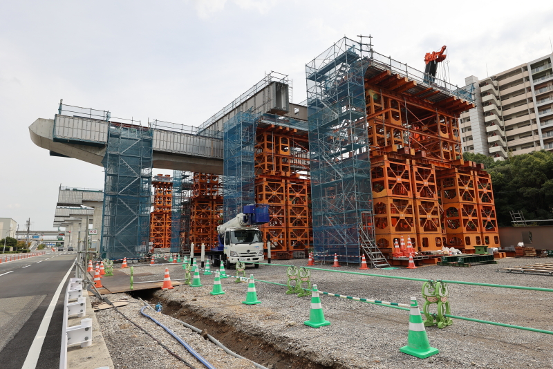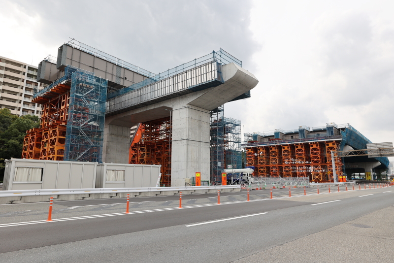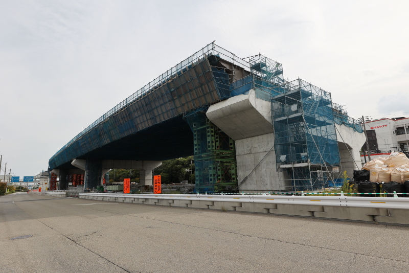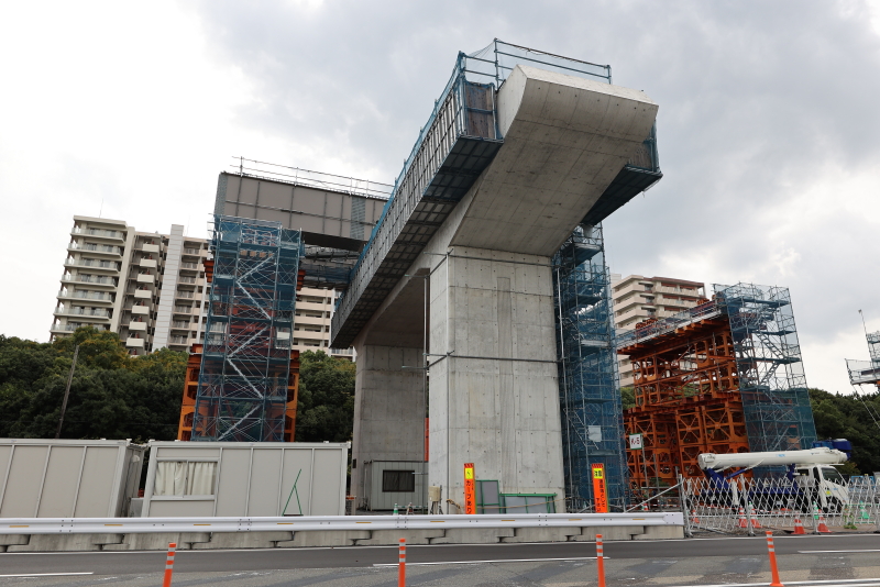 先行する工区の一部では、既に3基の橋脚の上に高架道路の橋桁が架橋され、遂に道路の建設が開始されたのを確認できたのが今春でした。橋脚の上に厚い道路の構築が行われています。