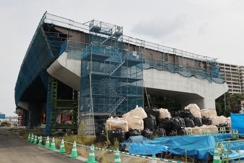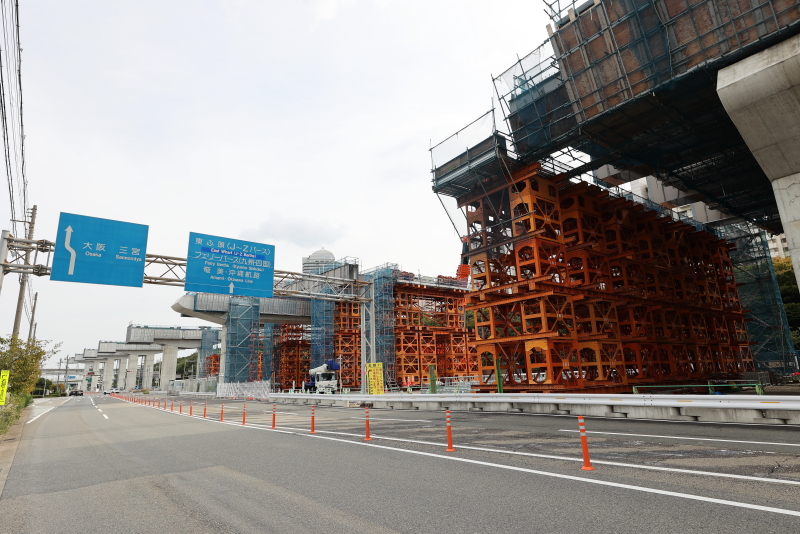 ここから東側の六甲アイランド東地区では、橋脚を設置する為の杭工事が継続しています。反対の西側の駒栄ランプ付近の地下区間も工事が続いています。この道路工事とリニア新幹線の東京-大阪間の工事はどちらが先に完成するでしょうか。開通時期を早めるには、複数区間の工事を同時に進めるしかありません。設計中とされる六甲アイランド-ポートアイランドの海上区間、ポートアイランド島内、そしてポートアイランド-駒栄までの海上区間も早期に着工し、せめて2034年とされているリニア新幹線の東京-名古屋間の開通と同時期に完成して欲しいですね。