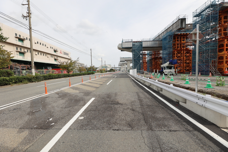 工事を進める為、臨港道路の南側は閉鎖され、東西方向両線は北側に車線変更・集約が行われました。