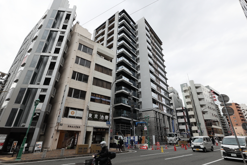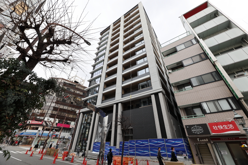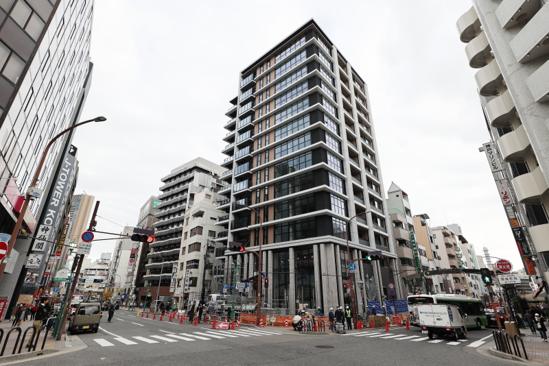 トアロードと生田新道の交差点東角に立地する旧山口銀行神店跡地に建設されてきた野村不動産の新築分譲マンションプロジェクト「プラウド神戸トアロード」。早くも全面的に足場の撤去が行われ、完成した外観が顕になりました!