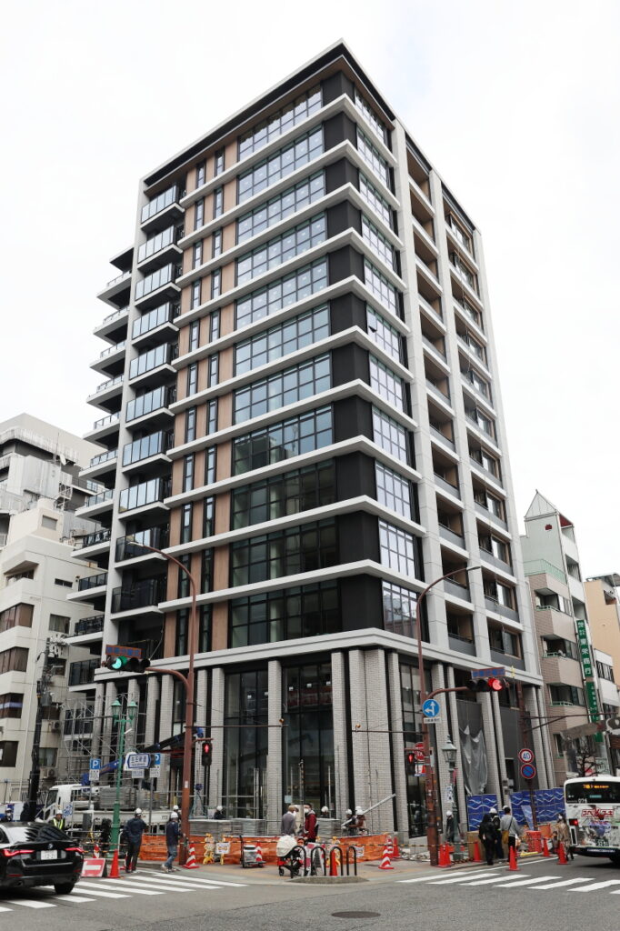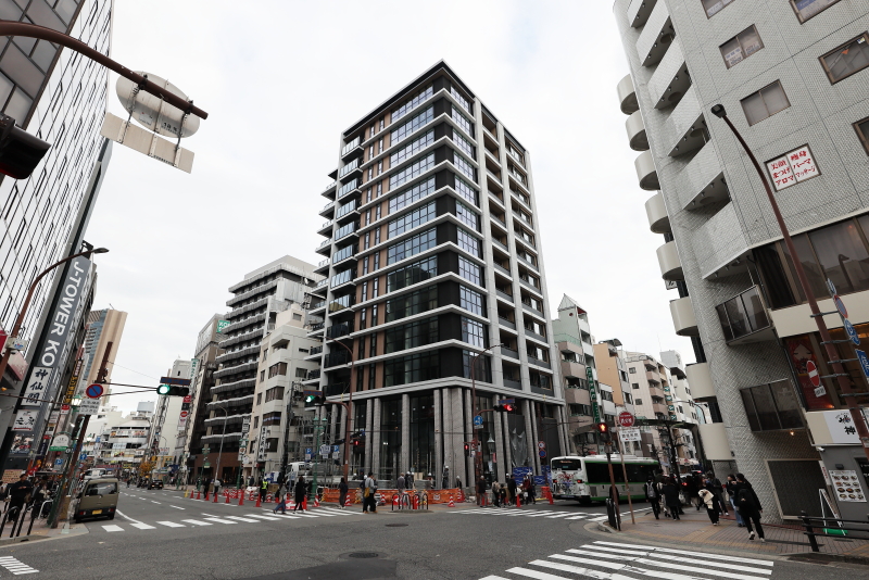 複数の狭小ビルの土地を集約してこの規模感を実現しています。スリムな建物が多いトアロードの中において、周囲の建物を大きく凌駕する高さもこの物件のランドマーク性を高めています。