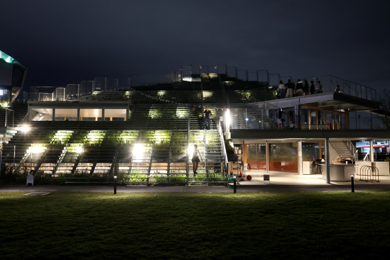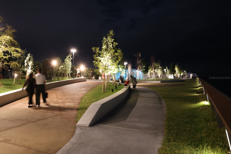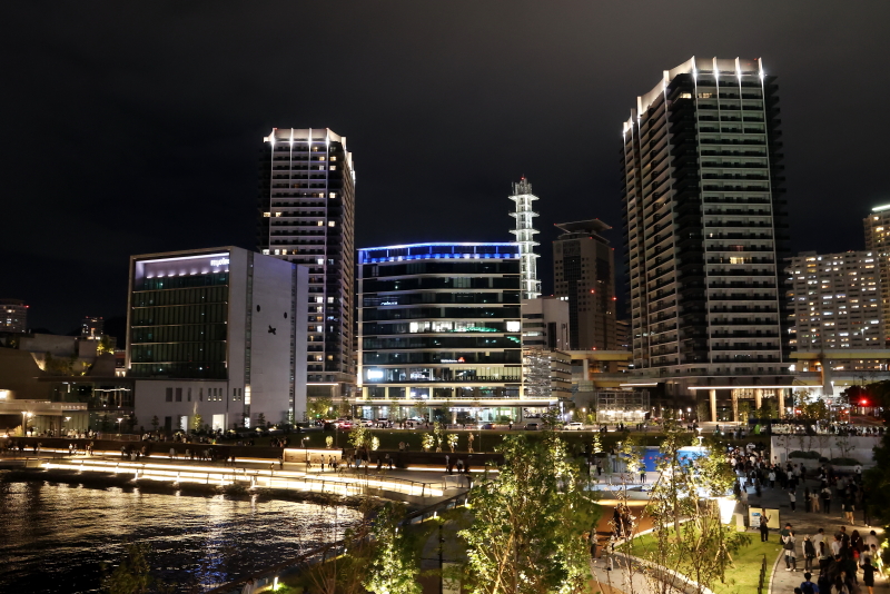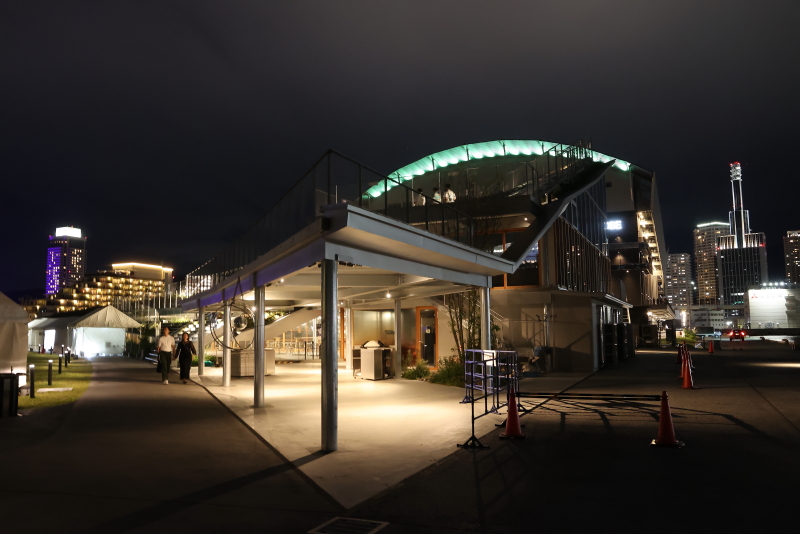 突堤の先端に完成した集客施設「緑の丘」。夜間には昼間とはまた異なった魅力があります。8月末にはBBQレストラン「EN³」がオープンしています。
