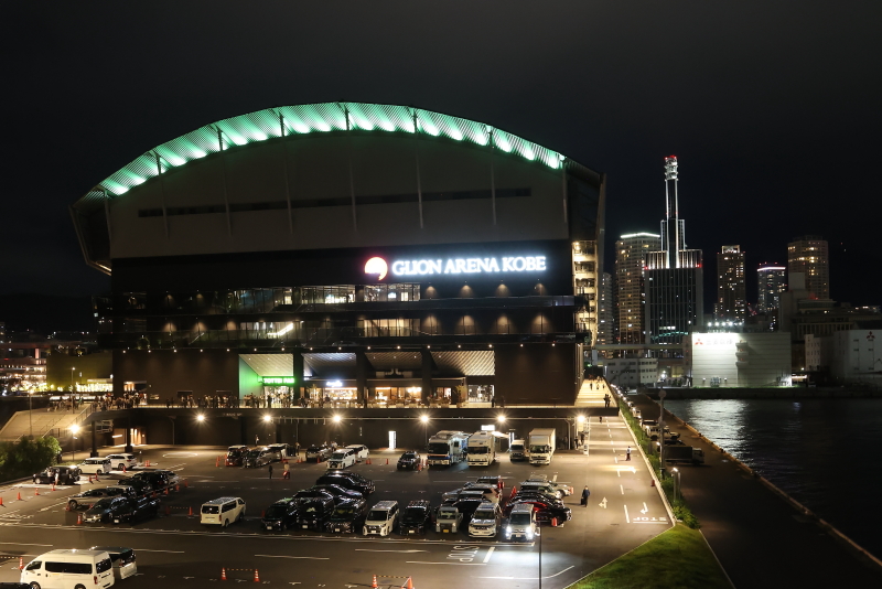 目の前には迫力のあるジーライオンアリーナ神戸が迫り、背後には三宮のビル群が輝いています。