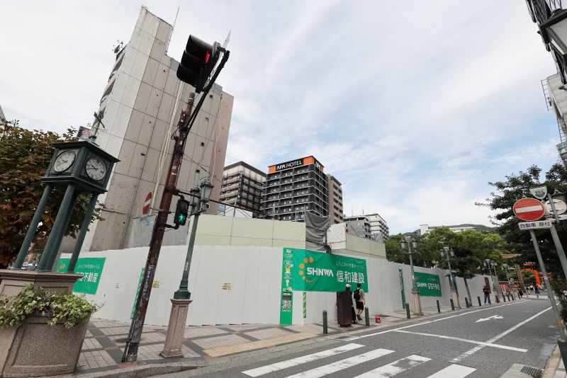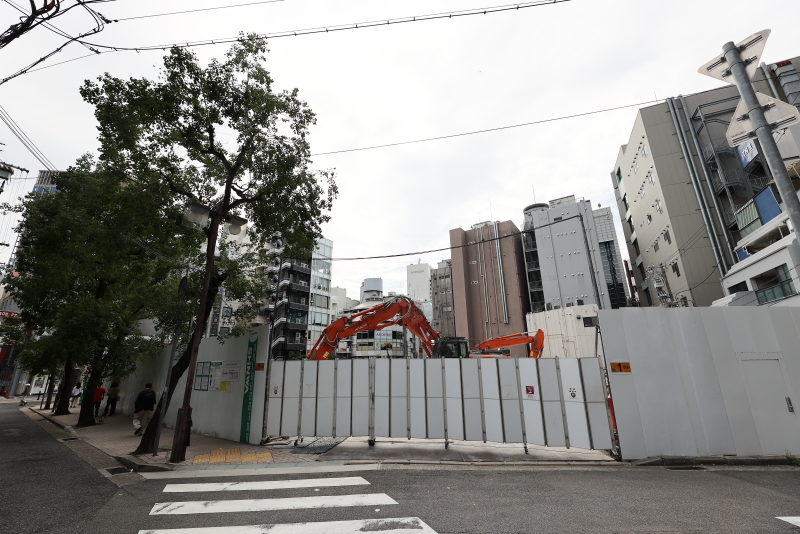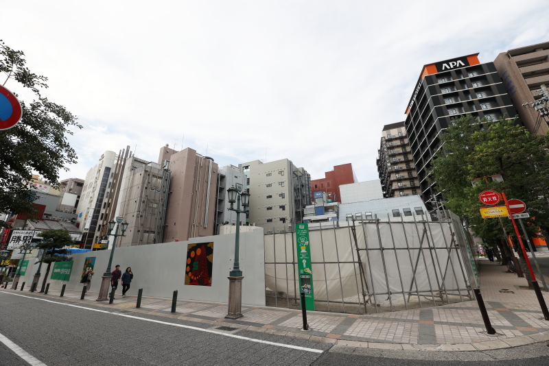 仮囲い以外、足場は全て撤去されましたが、地下鉄駅入口周りのみはまだ足場があるようです。入口は単独で供用再開されるのでしょうか。建物が無くなって一時的な開放感が広がっています。東西スパンはあまり大きな建物では無かったので、その規模は秘匿感がありましたが、解体されてみるとその大きさを実感します。
