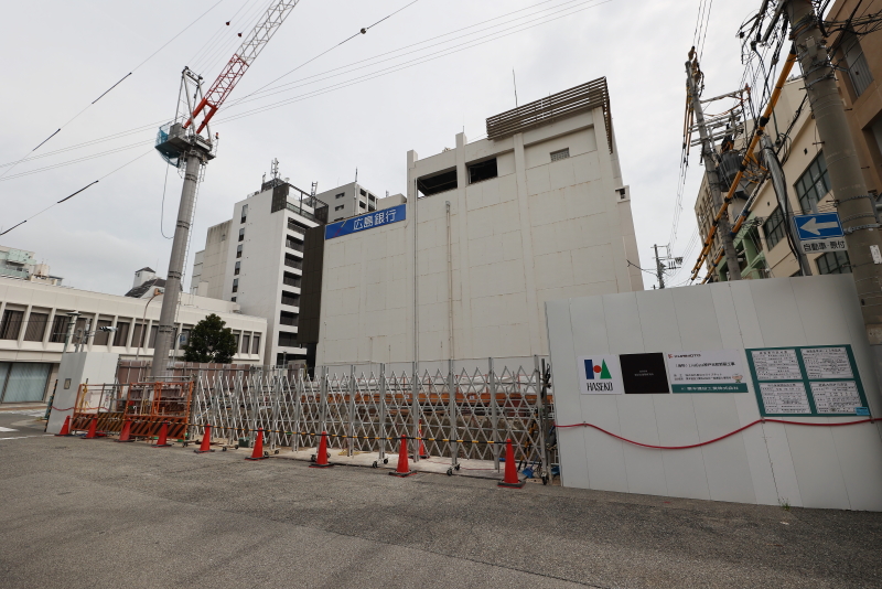 現在はタワークレーンを使って鉄筋コンクリート造の地上躯体構築中で、2階まで成長しています。西側に隣接した土地は老朽化したオフィスビル跡地で更地の状態が継続しています。